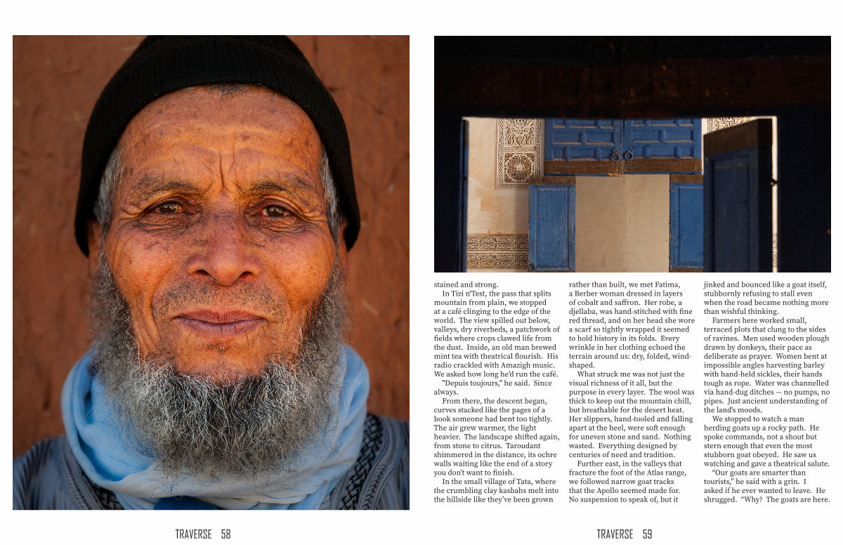 In Tizi n ' Test, the pass that splits mountain from plain, we stopped at a café clinging to the edge of the world. The view spilled out below, valleys, dry riverbeds, a patchwork of fields where crops clawed life from the dust. Inside, an old man brewed mint tea with theatrical flourish. His radio crackled with Amazigh music. We asked how long he’ d run the café. " Depuis toujours," he said. Since always.