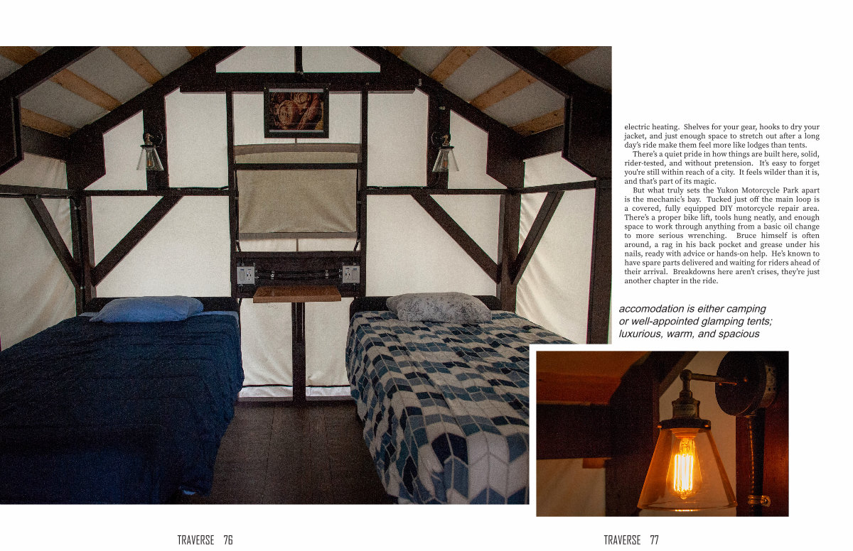 But what truly sets the Yukon Motorcycle Park apart is the mechanic’ s bay. Tucked just off the main loop is a covered, fully equipped DIY motorcycle repair area. There’ s a proper bike lift, tools hung neatly, and enough space to work through anything from a basic oil change to more serious wrenching. Bruce himself is often around, a rag in his back pocket and grease under his nails, ready with advice or hands-on help. He’ s known to have spare parts delivered and waiting for riders ahead of their arrival. Breakdowns here aren’ t crises, they’ re just another chapter in the ride.