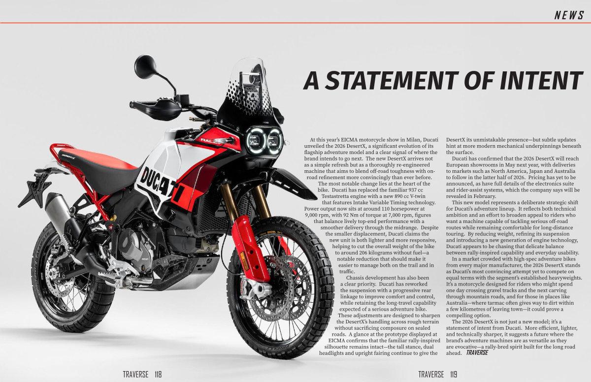 The 2026 DesertX is not just a new model; it’ s a statement of intent from Ducati. More efficient, lighter, and technically sharper, it suggests a future where the brand’ s adventure machines are as versatile as they are evocative— a rally-bred spirit built for the long road ahead. TRAVERSE