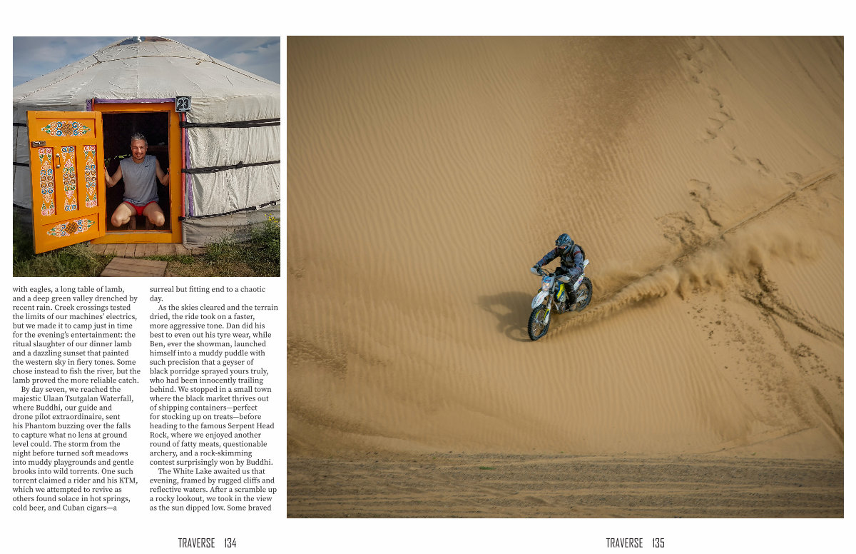 By day seven, we reached the majestic Ulaan Tsutgalan Waterfall, where Buddhi, our guide and drone pilot extraordinaire, sent his Phantom buzzing over the falls to capture what no lens at ground level could. The storm from the night before turned soft meadows into muddy playgrounds and gentle brooks into wild torrents. One such torrent claimed a rider and his KTM, which we attempted to revive as others found solace in hot springs, cold beer, and Cuban cigars— a surreal but fitting end to a chaotic day.