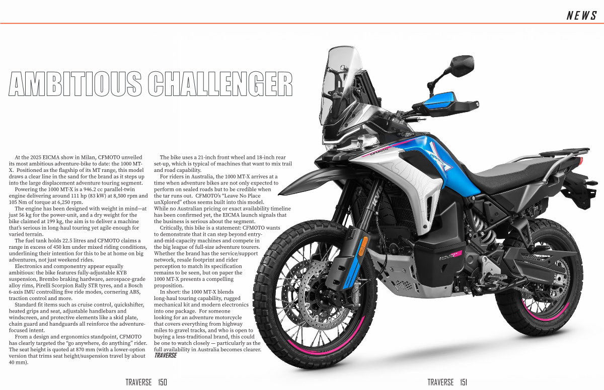 In short: the 1000 MT-X blends long-haul touring capability, rugged mechanical kit and modern electronics into one package. For someone looking for an adventure motorcycle that covers everything from highway miles to gravel tracks, and who is open to buying a less-traditional brand, this could be one to watch closely— particularly as the full availability in Australia becomes clearer.