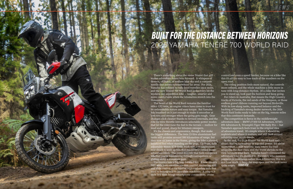 In the end, the 2026 Ténéré 700 World Raid isn’ t about chasing technology or top-end power. It’ s about momentum— that hypnotic state where the trail unspools, the dust rises, and the world shrinks to the view between your bars. Yamaha hasn’ t reinvented the adventure bike; it’ s distilled it. For riders who measure journeys in continents rather than kilometres, this is a machine made to keep the map open and the tank never quite empty. TRAVERSE