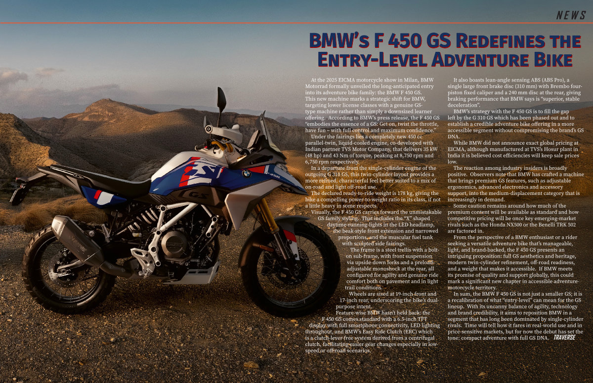 In sum, the BMW F 450 GS is not just a smaller GS; it is a recalibration of what“ entry-level” can mean for the GS lineup. With its uncanny balance of agility, technology and brand credibility, it aims to reposition BMW in a segment that has long been dominated by single-cylinder rivals. Time will tell how it fares in real-world use and in price-sensitive markets, but for now the debut has set the tone: compact adventure with full GS DNA. TRAVERSE