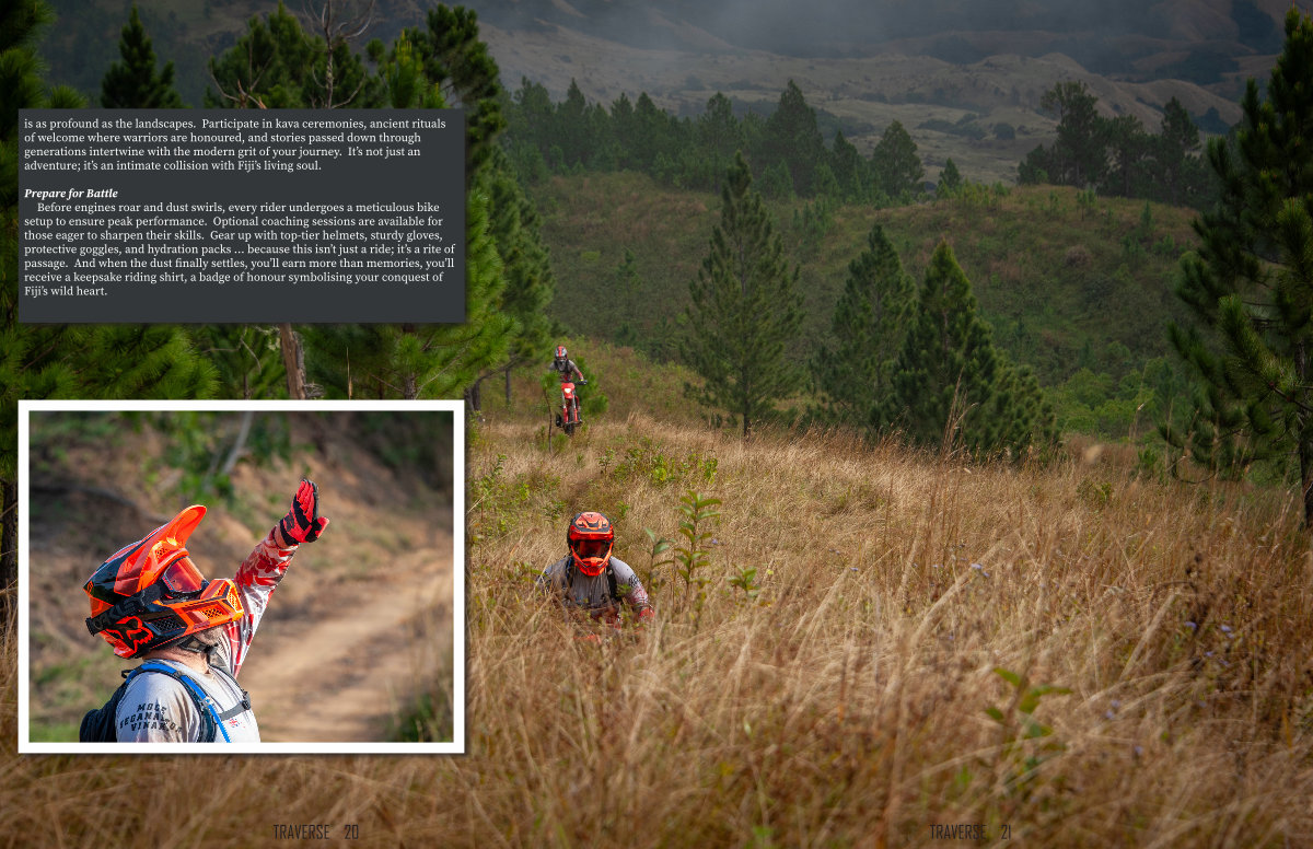 Before engines roar and dust swirls, every rider undergoes a meticulous bike setup to ensure peak performance. Optional coaching sessions are available for those eager to sharpen their skills. Gear up with top-tier helmets, sturdy gloves, protective goggles, and hydration packs … because this isn’ t just a ride; it’ s a rite of passage. And when the dust finally settles, you’ ll earn more than memories, you’ ll receive a keepsake riding shirt, a badge of honour symbolising your conquest of Fiji’ s wild heart.