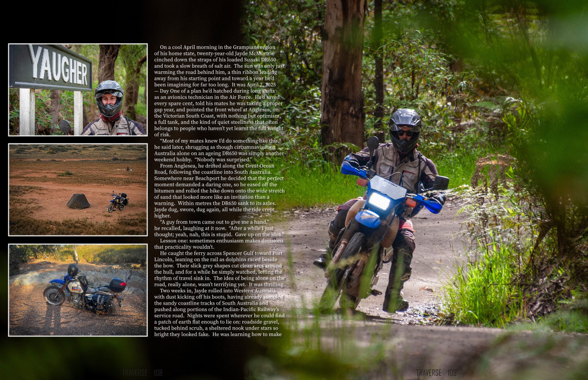 On a cool April morning in the Grampians region of his home state, twenty-year-old Jayde McMurtrie cinched down the straps of his loaded Suzuki DR650 and took a slow breath of salt air. The sun was only just warming the road behind him, a thin ribbon leading away from his starting point and toward a year he’ d been imagining for far too long. It was April 2, 2025— Day One of a plan he’ d hatched during long shifts as an avionics technician in the Air Force. He’ d saved every spare cent, told his mates he was taking a proper gap year, and pointed the front wheel at Anglesea, on the Victorian South Coast, with nothing but optimism, a full tank, and the kind of quiet steeliness that often belongs to people who haven’ t yet learnt the full weight of risk.