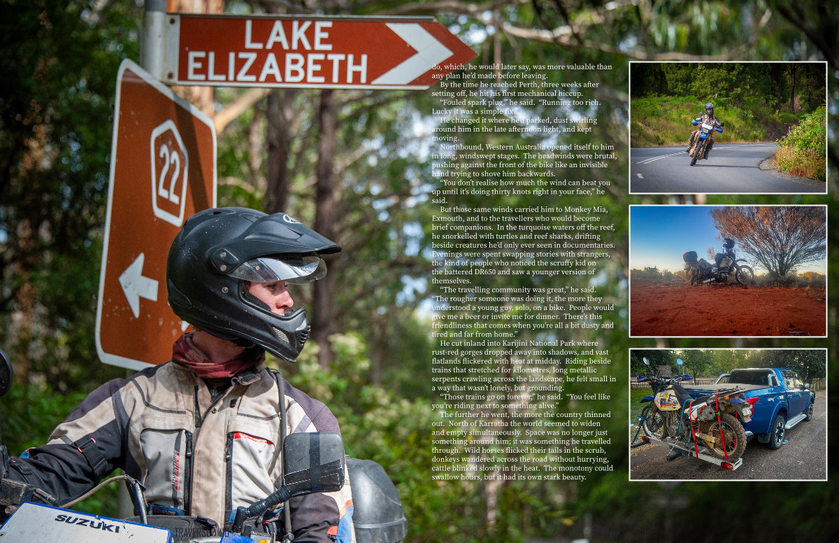 But those same winds carried him to Monkey Mia, Exmouth, and to the travellers who would become brief companions. In the turquoise waters off the reef, he snorkelled with turtles and reef sharks, drifting beside creatures he’ d only ever seen in documentaries. Evenings were spent swapping stories with strangers, the kind of people who noticed the scruffy kid on the battered DR650 and saw a younger version of themselves.