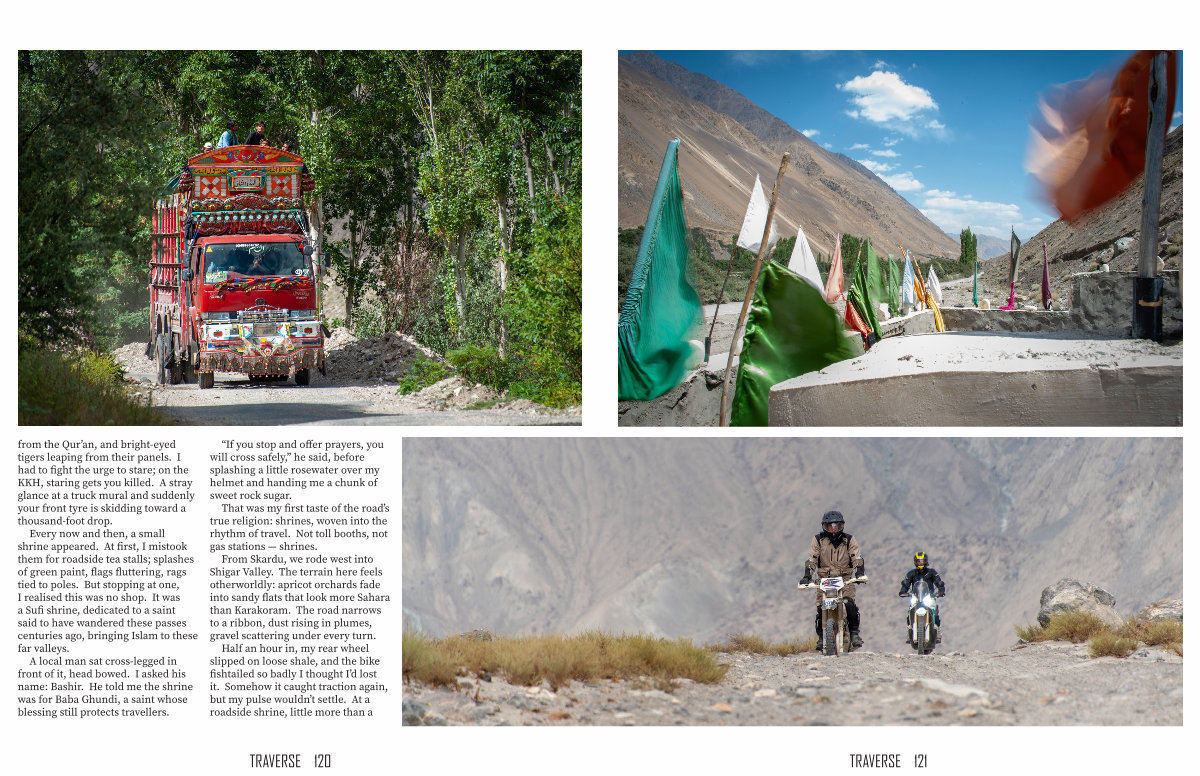 Every now and then, a small shrine appeared. At first, I mistook them for roadside tea stalls; splashes of green paint, flags fluttering, rags tied to poles. But stopping at one, I realised this was no shop. It was a Sufi shrine, dedicated to a saint said to have wandered these passes centuries ago, bringing Islam to these far valleys.