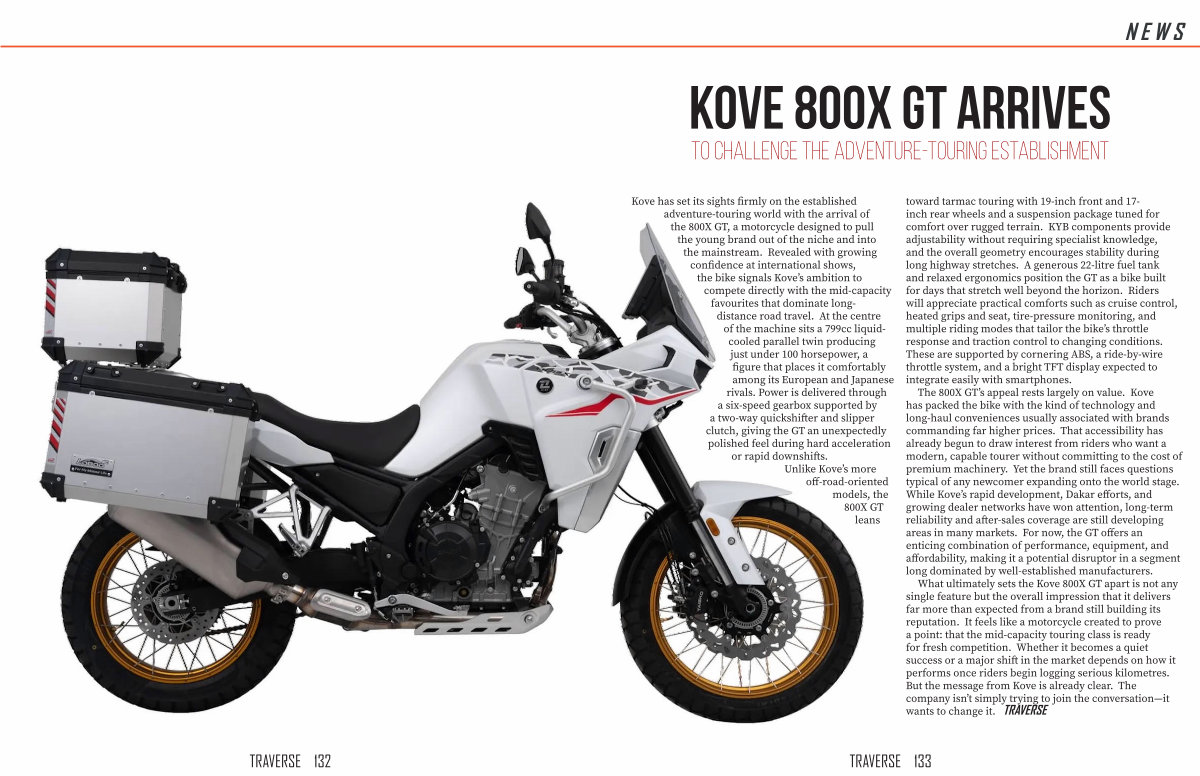 What ultimately sets the Kove 800X GT apart is not any single feature but the overall impression that it delivers far more than expected from a brand still building its reputation. It feels like a motorcycle created to prove a point: that the mid-capacity touring class is ready for fresh competition. Whether it becomes a quiet success or a major shift in the market depends on how it performs once riders begin logging serious kilometres. But the message from Kove is already clear. The company isn’ t simply trying to join the conversation— it wants to change it. TRAVERSE