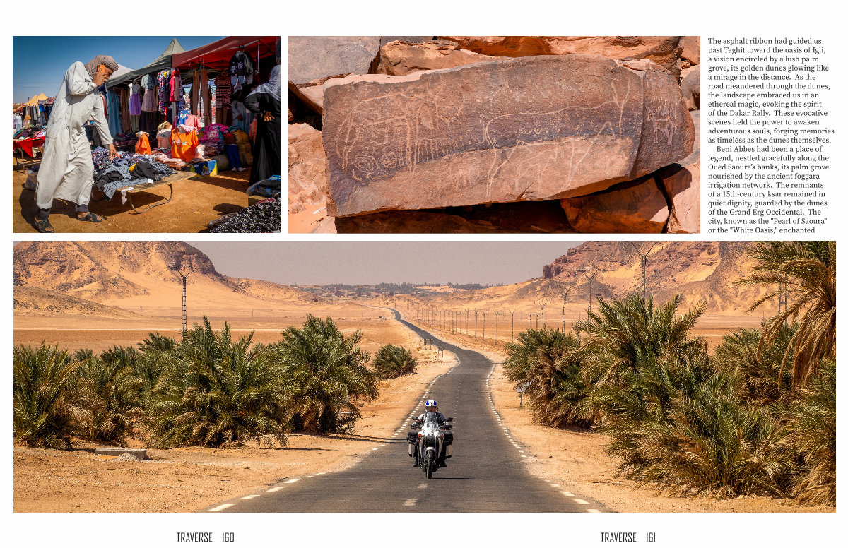 The asphalt ribbon had guided us past Taghit toward the oasis of Igli, a vision encircled by a lush palm grove, its golden dunes glowing like a mirage in the distance. As the road meandered through the dunes, the landscape embraced us in an ethereal magic, evoking the spirit of the Dakar Rally. These evocative scenes held the power to awaken adventurous souls, forging memories as timeless as the dunes themselves. Beni Abbes had been a place of legend, nestled gracefully along the Oued Saoura’ s banks, its palm grove nourished by the ancient foggara irrigation network. The remnants of a 15th-century ksar remained in quiet dignity, guarded by the dunes of the Grand Erg Occidental. The city, known as the " Pearl of Saoura " or the " White Oasis," enchanted