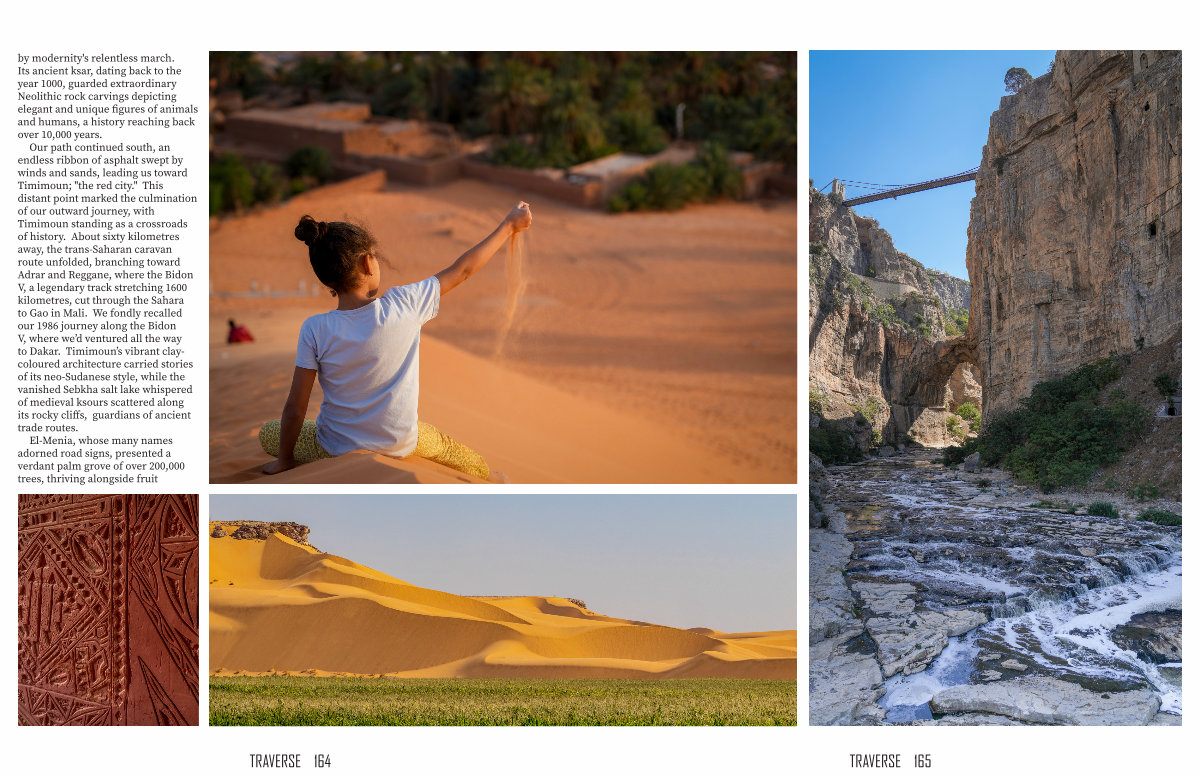 Our path continued south, an endless ribbon of asphalt swept by winds and sands, leading us toward Timimoun; " the red city." This distant point marked the culmination of our outward journey, with Timimoun standing as a crossroads of history. About sixty kilometres away, the trans-Saharan caravan route unfolded, branching toward Adrar and Reggane, where the Bidon V, a legendary track stretching 1600 kilometres, cut through the Sahara to Gao in Mali. We fondly recalled our 1986 journey along the Bidon V, where we’ d ventured all the way to Dakar. Timimoun’ s vibrant claycoloured architecture carried stories of its neo-Sudanese style, while the vanished Sebkha salt lake whispered of medieval ksours scattered along its rocky cliffs, guardians of ancient trade routes.