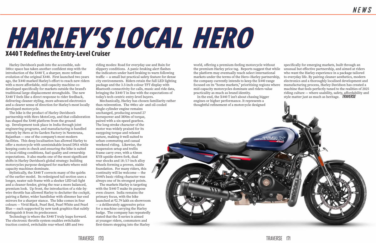 In the end, the X440 T isn’ t about chasing bigger engines or higher performance. It represents a thoughtful refinement of a motorcycle designed specifically for emerging markets, built through an unusual but effective partnership, and aimed at riders who want the Harley experience in a package tailored to everyday life. By pairing cleaner aesthetics, modern electronics and a thoroughly localised development and manufacturing process, Harley-Davidson has created a machine that feels perfectly tuned to the realities of 2025 riding culture— where usability, safety, affordability and style matter just as much as heritage. TRAVERSE