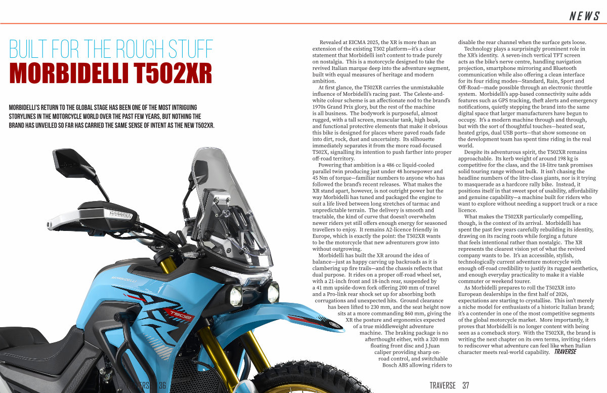 As Morbidelli prepares to roll the T502XR into European dealerships in the first half of 2026, expectations are starting to crystallise. This isn’ t merely a niche model for enthusiasts of a historic Italian brand; it’ s a contender in one of the most competitive segments of the global motorcycle market. More importantly, it proves that Morbidelli is no longer content with being seen as a comeback story. With the T502XR, the brand is writing the next chapter on its own terms, inviting riders to rediscover what adventure can feel like when Italian character meets real-world capability. TRAVERSE
