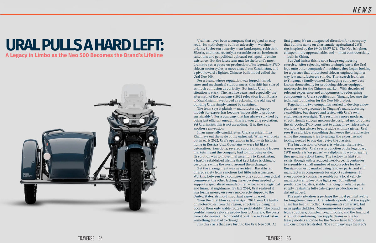 Ural has never been a company that enjoyed an easy road. Its mythology is built on adversity— wartime origins, Soviet-era austerity, near-bankruptcy, rebirth in Siberia, and most recently, a scramble across borders as sanctions and geopolitical upheaval reshaped its entire existence. But the latest turn may be the brand’ s most dramatic yet: a pause on production of its legendary 2WD sidecar motorcycles, a move away from Kazakhstan, and a pivot toward a lighter, Chinese-built model called the Ural Neo 500.