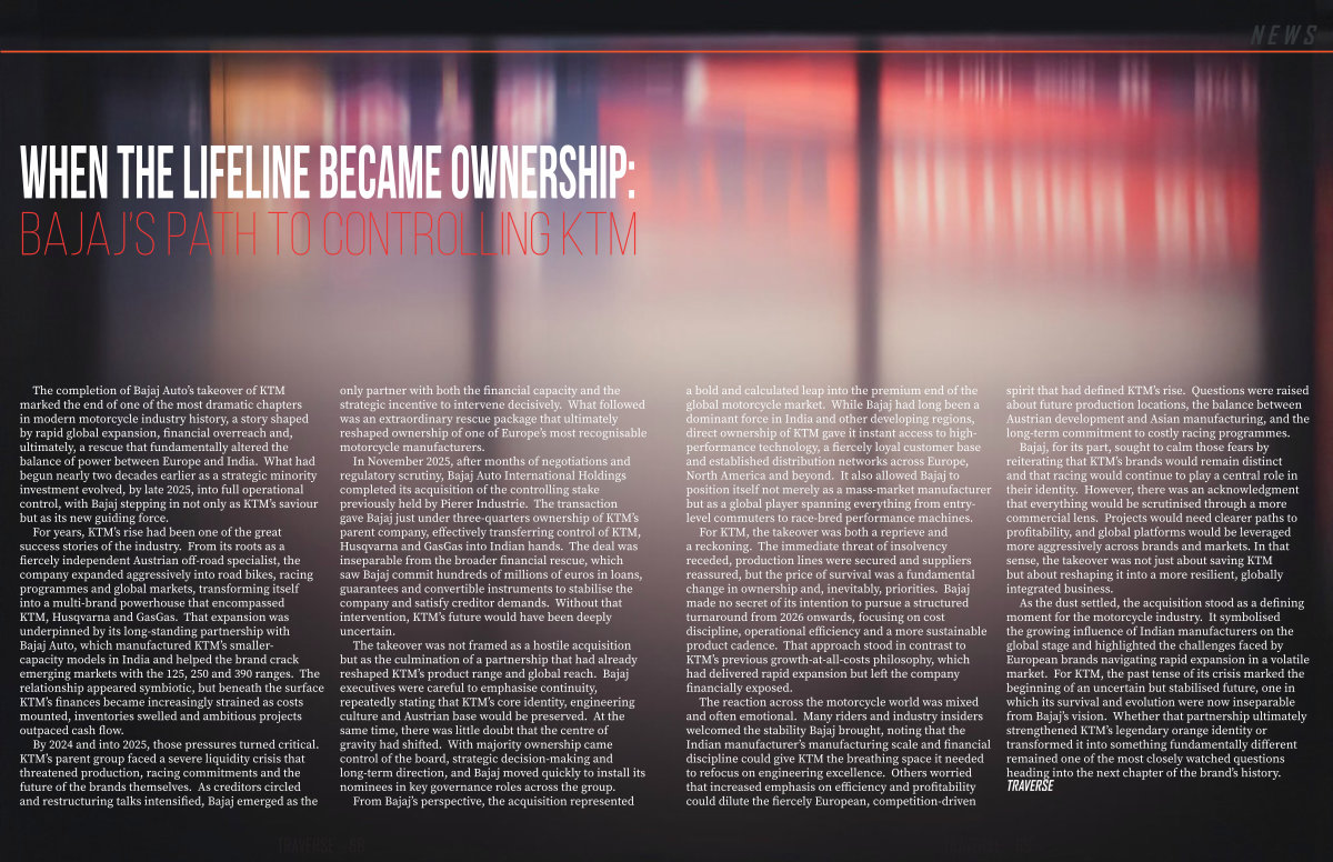 As the dust settled, the acquisition stood as a defining moment for the motorcycle industry. It symbolised the growing influence of Indian manufacturers on the global stage and highlighted the challenges faced by European brands navigating rapid expansion in a volatile market. For KTM, the past tense of its crisis marked the beginning of an uncertain but stabilised future, one in which its survival and evolution were now inseparable from Bajaj’ s vision. Whether that partnership ultimately strengthened KTM’ s legendary orange identity or transformed it into something fundamentally different remained one of the most closely watched questions heading into the next chapter of the brand’ s history.