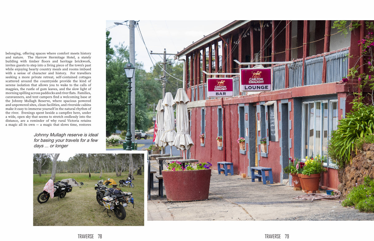 belonging, offering spaces where comfort meets history and nature. The Harrow Hermitage Hotel, a stately building with timber floors and heritage brickwork, invites guests to step into a living piece of the town’ s past while enjoying hearty country meals and rooms imbued with a sense of character and history. For travellers seeking a more private retreat, self-contained cottages scattered around the countryside provide the kind of serene isolation that allows you to wake to the calls of magpies, the rustle of gum leaves, and the slow light of morning spilling across paddocks and river flats. Families, caravanners, and tent campers find a welcoming base at the Johnny Mullagh Reserve, where spacious powered and unpowered sites, clean facilities, and riverside cabins make it easy to immerse yourself in the natural rhythm of the river. Evenings spent beside a campfire here, under a wide, open sky that seems to stretch endlessly into the distance, are a reminder of why rural Victoria retains a magic all its own— a magic that slows time, restores