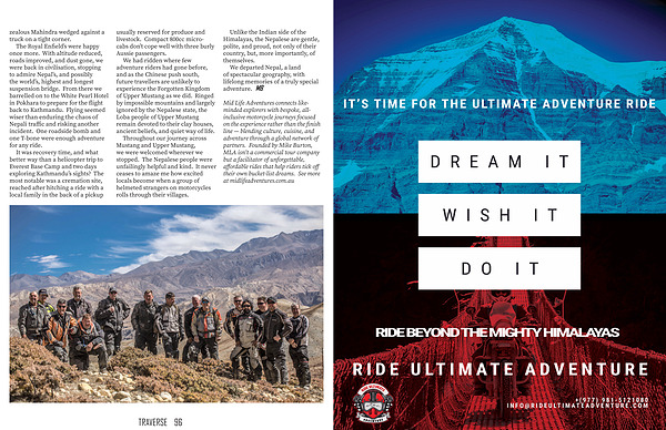We had ridden where few adventure riders had gone before, and as the Chinese push south, future travellers are unlikely to experience the Forgotten Kingdom of Upper Mustang as we did. Ringed by impossible mountains and largely ignored by the Nepalese state, the Loba people of Upper Mustang remain devoted to their clay houses, ancient beliefs, and quiet way of life.