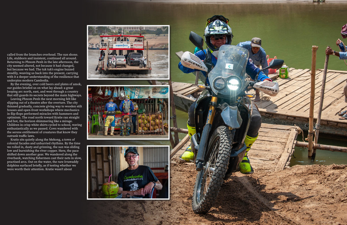 Leaving Phnom Penh the next morning felt like slipping out of a theatre after the overture. The city thinned gradually, concrete giving way to wooden stilt houses and open-front workshops where mechanics in flip-flops performed miracles with hammers and optimism. The road north toward Kratie ran straight and hot, the horizon shimmering like a mirage. Children in crisp white shirts cycled to school, waving enthusiastically as we passed. Cows wandered with the serene entitlement of creatures that know they outrank traffic laws.