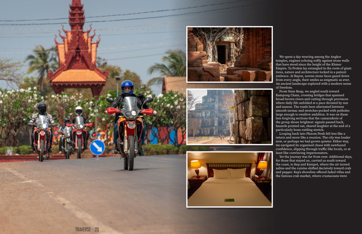 We spent a day weaving among the Angkor temples, engines echoing softly against stone walls that have stood since the height of the Khmer Empire. Ta Prohm lay entangled in the roots of giant trees, nature and architecture locked in a patient embrace. At Bayon, serene stone faces gazed down from every angle, their smiles as enigmatic as ever. An ancient landscape explored with a modern sense of freedom.