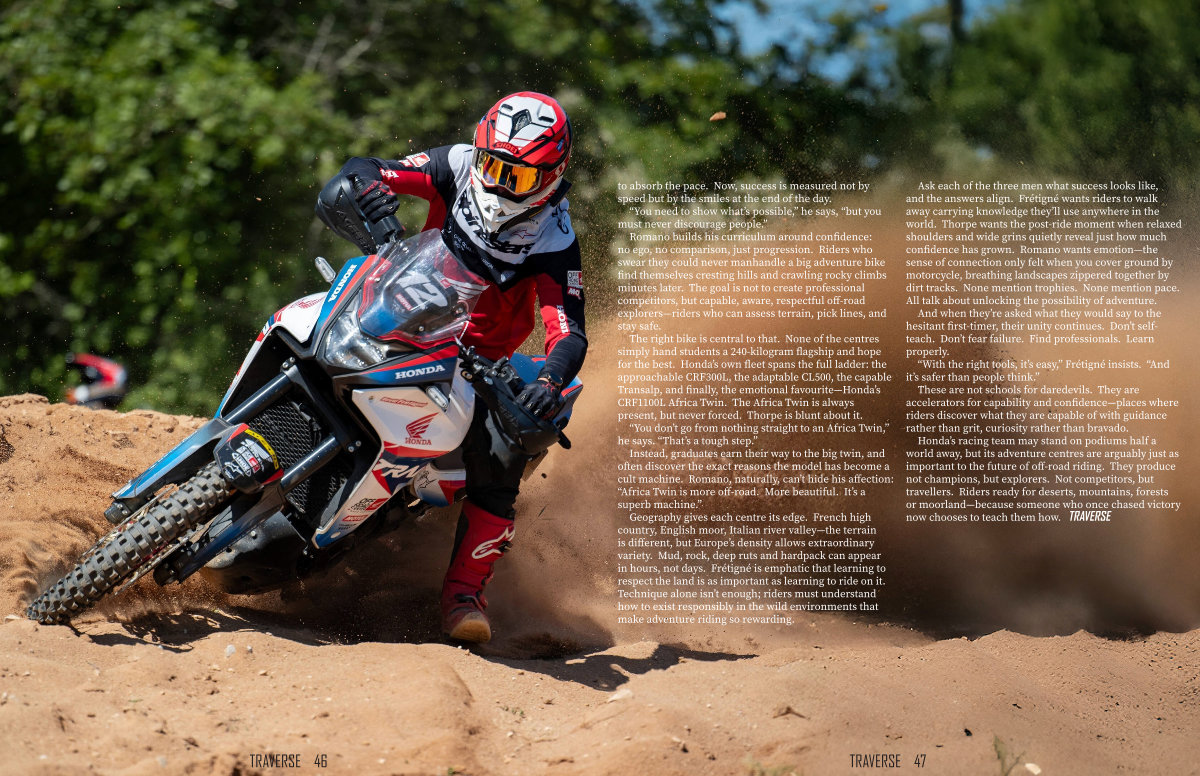 Honda’ s racing team may stand on podiums half a world away, but its adventure centres are arguably just as important to the future of off-road riding. They produce not champions, but explorers. Not competitors, but travellers. Riders ready for deserts, mountains, forests or moorland— because someone who once chased victory now chooses to teach them how. TRAVERSE