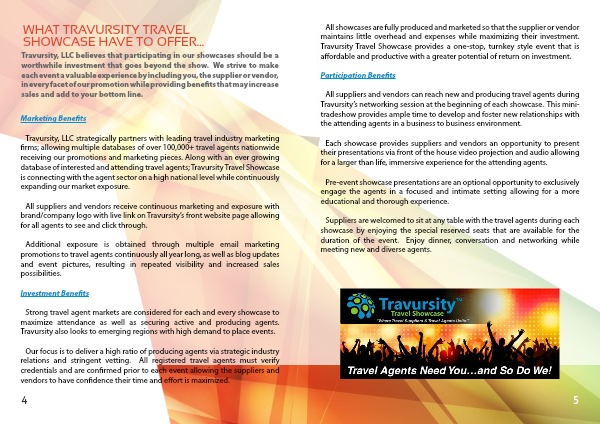 Travursity, LLC believes that participating in our showcases should be a worthwhile investment that goes beyond the show. We strive to make each event a valuable experience by including you, the supplier or vendor, in every facet of our promotion while providing benefits that may increase sales and add to your bottom line.