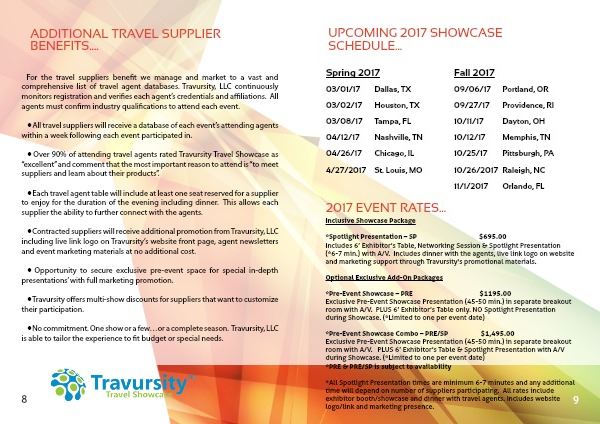 ● Contracted suppliers will receive additional promotion from Travursity, LLC including live link logo on Travursity’s website front page, agent newsletters and event marketing materials at no additional cost.