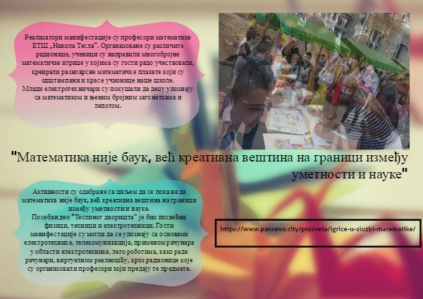 Реализатори манифестације су професори математике ЕТШ „Никола Тесла“. Организоване су различите радионице, ученици су направили многобројне математичке игрице у којима су гости радо учествовали, креирали разноврсне математичке плакате који су одштампани и красе учионице наше школе.
