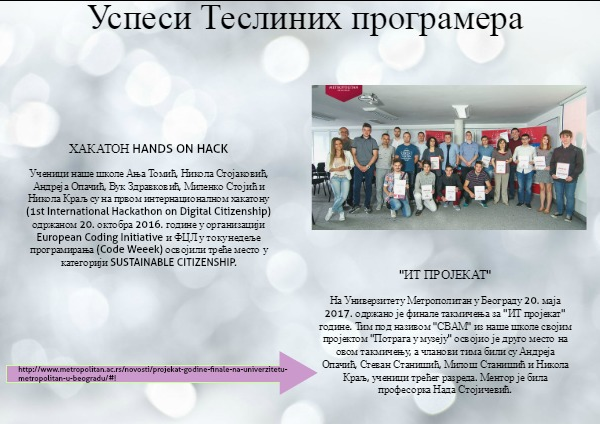 На Универзитету Метрополитан у Београду 20. маја 2017. одржано је финале такмичења за "ИТ пројекат" године. Тим под називом "СВАМ" из наше школе својим пројектом "Потрага у музеју" освојио је друго место на овом такмичењу, а чланови тима били су Андреја Опачић, Стеван Станишић, Милош Станишић и Никола Краљ, ученици трећег разреда. Ментор је била професорка Нада Стојичевић.