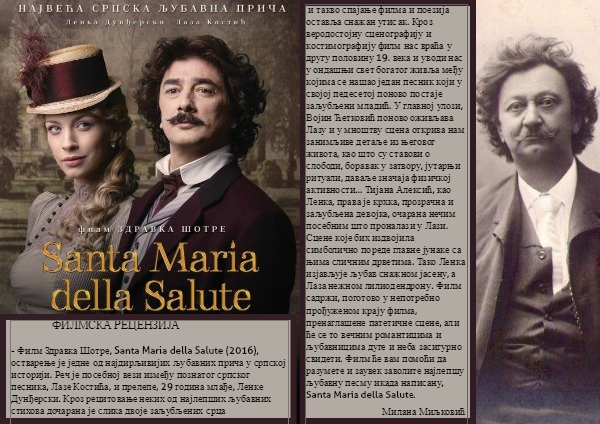 и такво спајање филма и поезија оставља снажан утисак. Кроз веродостојну сценографију и костимографију филм нас враћа у другу половину 19. века и уводи нас у ондашњи свет богатог живља међу којима се нашао један песник који у својој педесетој поново постаје заљубљени младић. У главној улози, Војин Ћетковић поново оживљава Лазу и у мноштву сцена открива нам занимљиве детаље из његовог живота, као што су ставови о слободи, боравак у затвору, јутарњи ритуали, даваље значаја физичкој активности... Тијана Алексић, као Ленка, права је крхка, прозрачна и заљубљена девојка, очарана нечим посебним што проналази у Лази. Сцене које бих издвојила симболично пореде главне јунаке са њима сличним дрветима. Тако Ленка изјављује љубав снажном јасену, а Лаза нежном лилиодендрону. Филм садржи, поготово у непотребно прођуженом крају филма, пренаглашене патетичне сцене, али ће се то вечним романтицима и љубавницима дуге и неба засигурно свидети. Филм ће вам помоћи да разумете и заувек заволите најлепшу љубавну песму икада написану, Santa Mariа della Salutе.
