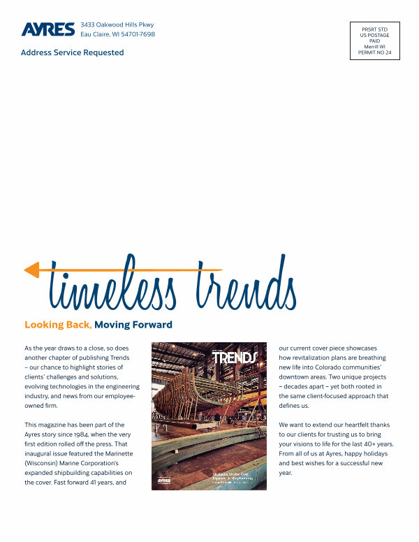 As the year draws to a close, so does another chapter of publishing Trends – our chance to highlight stories of clients’ challenges and solutions, evolving technologies in the engineering industry, and news from our employeeowned firm. our current cover piece showcases how revitalization plans are breathing new life into Colorado communities’ downtown areas. Two unique projects – decades apart – yet both rooted in the same client-focused approach that defines us.