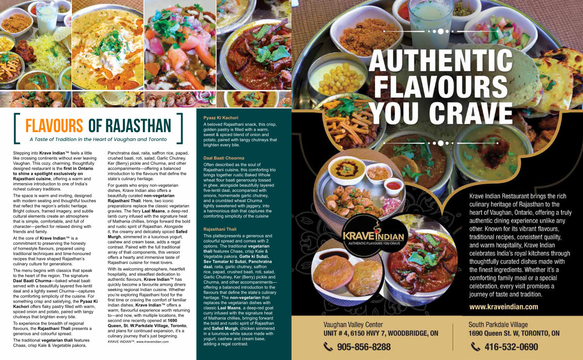 Stepping into Krave Indian™ feels a little like crossing continents without ever leaving Vaughan. This cozy, charming, thoughtfully designed restaurant is the first in Ontario to shine a spotlight exclusively on Rajasthani cuisine, offering a warm and immersive introduction to one of India’ s richest culinary traditions.