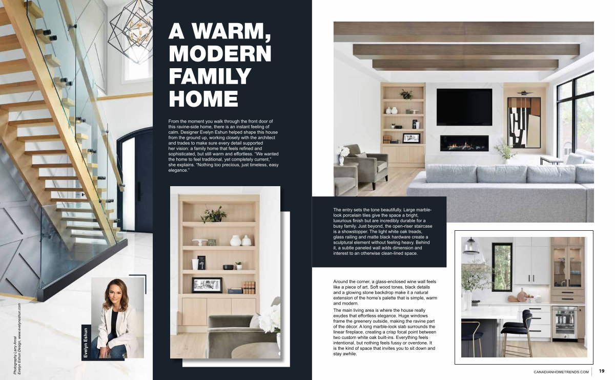 From the moment you walk through the front door of this ravine-side home, there is an instant feeling of calm. Designer Evelyn Eshun helped shape this house from the ground up, working closely with the architect and trades to make sure every detail supported her vision: a family home that feels refined and sophisticated, but still warm and effortless.“ We wanted the home to feel traditional, yet completely current,” she explains.“ Nothing too precious, just timeless, easy elegance.”