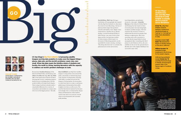 David Kline , PhD ’ 05 of Scripps Institution of Oceanography has teamed with the Big Pixel Initiative to determine the extent of coral bleaching — the loss of photosynthetic algae that produces colorful and healthy reefs . Higher water temperatures , whether due to climate change , a record-breaking El Niño or other factors , can cause corals to lose algae and die , leaving large swathes of white remains . Kline ’ s goal is to determine if bleaching episodes can be quantified by remote sensing , creating a “ bleaching detection tool ” to estimate the phenomenon ’ s extent and severity .