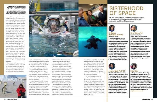 105 DAYS IN SPACE ( AND COUNTING ) 7 HRS , 17 MIN ON SPACEWALK ( SO FAR ) → A marine biologist and SIO graduate , Meir became the third alumna in space this past September . A dual citizen of the U . S . and Sweden , she is the first Swedish woman in space , and on October 18 , took part in the first all-female spacewalk with Christina Koch to perform station maintenance . “ What we ' re doing now shows all the work that went in for the decades prior , all of the women who worked to get us where we are today .”