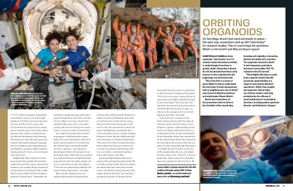 “ This is the first in a series of space flights to help us understand the intricacies of brain development , both in weightlessness and on Earth ,” says School of Medicine professor and study leader Allyson Muotri . Muotri and researchers on the ground were able to observe the formation of the neural tube , including cell migration , interaction , division and death , all in real time . The organoids returned to Earth in mid-September , just before astronaut Jessica Meir , PhD ’ 09 , rocketed to the ISS herself .