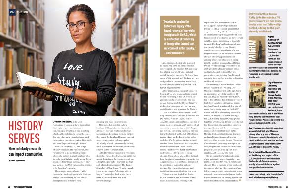 LIVING IN SAN DIEGO , Kelly Lytle Hernández ’ 96 couldn ’ t have been older than eight when she witnessed something so troubling it had a lasting effect on the scholar she would become : She was playing in the schoolyard and came across her friend , crying . Her uncle had been deported the night before .