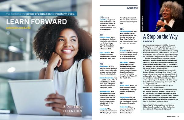 ONE OF MY MOST MEMORABLE DAYS at UC San Diego was in 2014 , when we brought Angela Davis , MA ’ 69 , back to campus for the keynote address at the Black History Scholarship Brunch held every February . She was coming from Northern California , but her flight was canceled due to weather . She took it upon herself to get a different flight out , and called me on my personal phone to let me know . Trust me , getting a phone call from Angela Davis is a wonderful and frightening experience . She asked me if I would pick her up at the airport . Again , an amazing and frightening experience , to which I said , “ Of course I will !” Are you kidding me ? Just being able to ride in the car with her and talk about life was eye-opening .