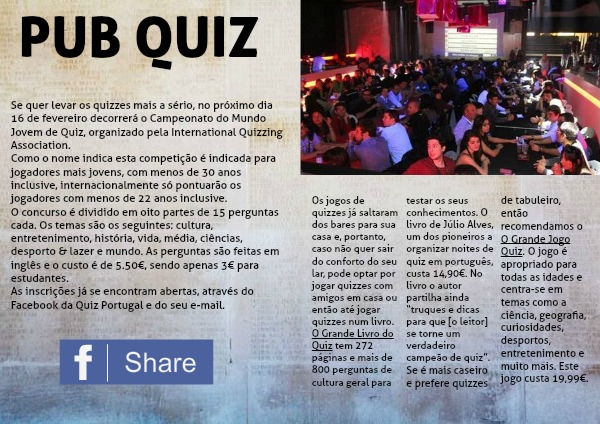 Os jogos de quizzes já saltaram dos bares para sua casa e, portanto, caso não quer sair do conforto do seu lar, pode optar por jogar quizzes com amigos em casa ou então até jogar quizzes num livro. O Grande Livro do Quiz tem 272 páginas e mais de 800 perguntas de cultura geral para testar os seus conhecimentos. O livro de Júlio Alves, um dos pioneiros a organizar noites de quiz em português, custa 14,90€. No livro o autor partilha ainda “truques e dicas para que [o leitor] se torne um verdadeiro campeão de quiz”.