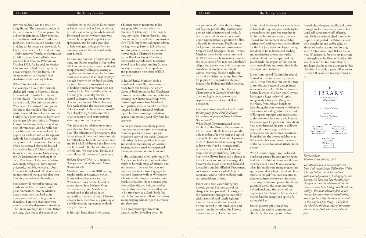 No. 140 The Trusty Servant our picture of Matthew this is a large red flag, the people’ s flag, emblazoned perhaps with a hammer and sickle. It is a reminder of his service as a trade union representative, a position he filled diligently for five years. Finally, in the background, are two great mansions – Sergeant’ s and Kingsgate House – where Matthew spent his time as a tutor and( in Phil’ s) assistant housemaster. Boys in the house most often mention Matthew’ s teleporting powers – an ability to appear anywhere, at any time, seemingly without warning. He ran a tight ship on his duty nights but always had time for pupils. He is regarded with great fondness by Philites and Beloeites alike.