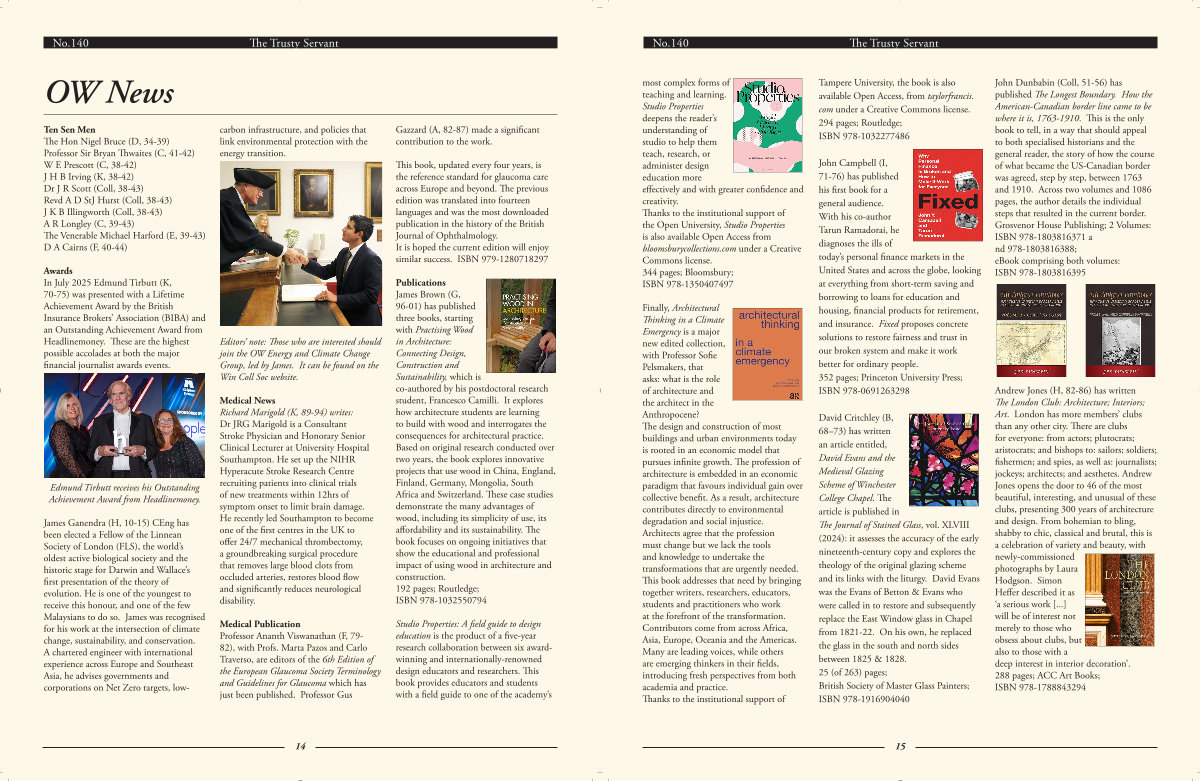 David Critchley( B, 68 – 73) has written an article entitled, David Evans and the Medieval Glazing Scheme of Winchester College Chapel. The article is published in The Journal of Stained Glass, vol. XLVIII( 2024): it assesses the accuracy of the early nineteenth-century copy and explores the theology of the original glazing scheme and its links with the liturgy. David Evans was the Evans of Betton & Evans who were called in to restore and subsequently replace the East Window glass in Chapel from 1821-22. On his own, he replaced the glass in the south and north sides between 1825 & 1828. 25( of 263) pages; British Society of Master Glass Painters; ISBN 978-1916904040