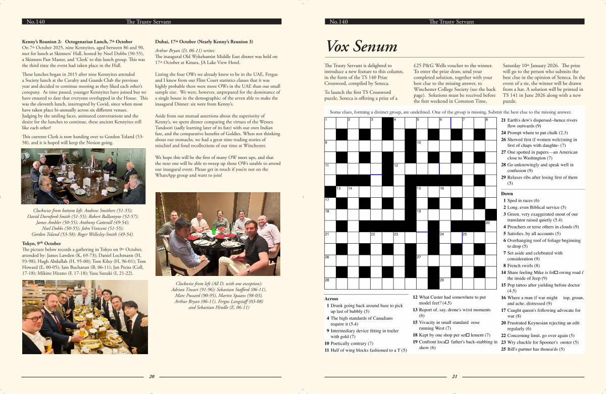 Kenny’ s Reunion 2: Octogenarian Lunch, 7 th October On 7 th October 2025, nine Kennyites, aged between 86 and 90, met for lunch at Skinners’ Hall, hosted by Noel Dobbs( 50-55), a Skinners Past Master, and‘ Clerk’ to this lunch group. This was the third time the event had taken place in the Hall.