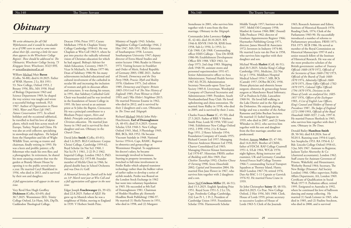 Michael Woods Haslett( Coll, 46-51); died 20.5.2025. Scholar King’ s College Cambridge 1951, Medicine, 2( i) Nat Sci pt 1 1954. Middlesex Hospital Medical School 1954-7, MB, BCh( Cantab) 1957; DObst RCOG 1958. House physician and obstetric house surgeon; obstetrics & gynaecology house surgeon at Manchester Royal Infirmary; GP at Poulton-le-Fylde, Lancashire 1960-94. He loved hill walking in the Lake District and in the Alps and the Dolomites. He enjoyed playing bridge and was a member of the Arthur Ransome and John Buchan Societies. He married( 1) Isobel Sargeant in 1959, who died in 2007, and( 2) Sonia Whitaker in 2012, who survives him together with his son and daughter from the first marriage; another son predeceased.