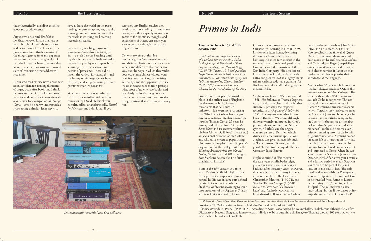 As this edition goes to print, a party of Wykeham Patrons travels to India in the footsteps of Wykehamists‘ From Stephens to Stagg’. Sir Richard Stagg( G, 69-73; Warden, 19-) and quondam High Commissioner to India needs little introduction. The remarkable life of, and bold title ascribed to, Thomas Stephens( Coll, 1565) need somewhat more. Christopher Normand takes up the story: