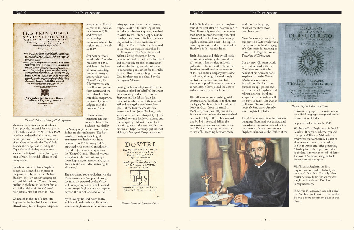 His influence on travel writing might be speculative, but there is no doubting the legacy Stephens left in his adopted home in Goa. From his arrival in 1579, Stephens spent 40 years at the Salcete mission( where the massacre had occurred in July 1583). He remarked that by 1581 he could deliver the sacrament to Goanese converts in the local Konkani language and over the course of his teaching he wrote many works in that language, of which the three most prominent are: