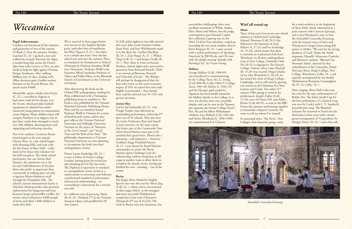 63,328 under-eighteen-year-olds entered this year’ s John Locke Institute Global Essay Prize, and four Wykehamists made it to the short list: Lachlan MacBean( B, 23-), Zain Naqui( A, 21-), Wilson Tang( Coll, 21-) and Jacques Scully( B, 24-). They chose to write on human freedom, animal rights and a provocative quotation from Bertrand Russell:‘ Hitler is an outcome of Rousseau; Roosevelt and Churchill, of Locke.’ The Warden will perhaps be disappointed that the boys who wrote on the socio-economic impact of VAT on school fees were only Highly Commended – they should have read his editorial( see TS 139) with greater attention.