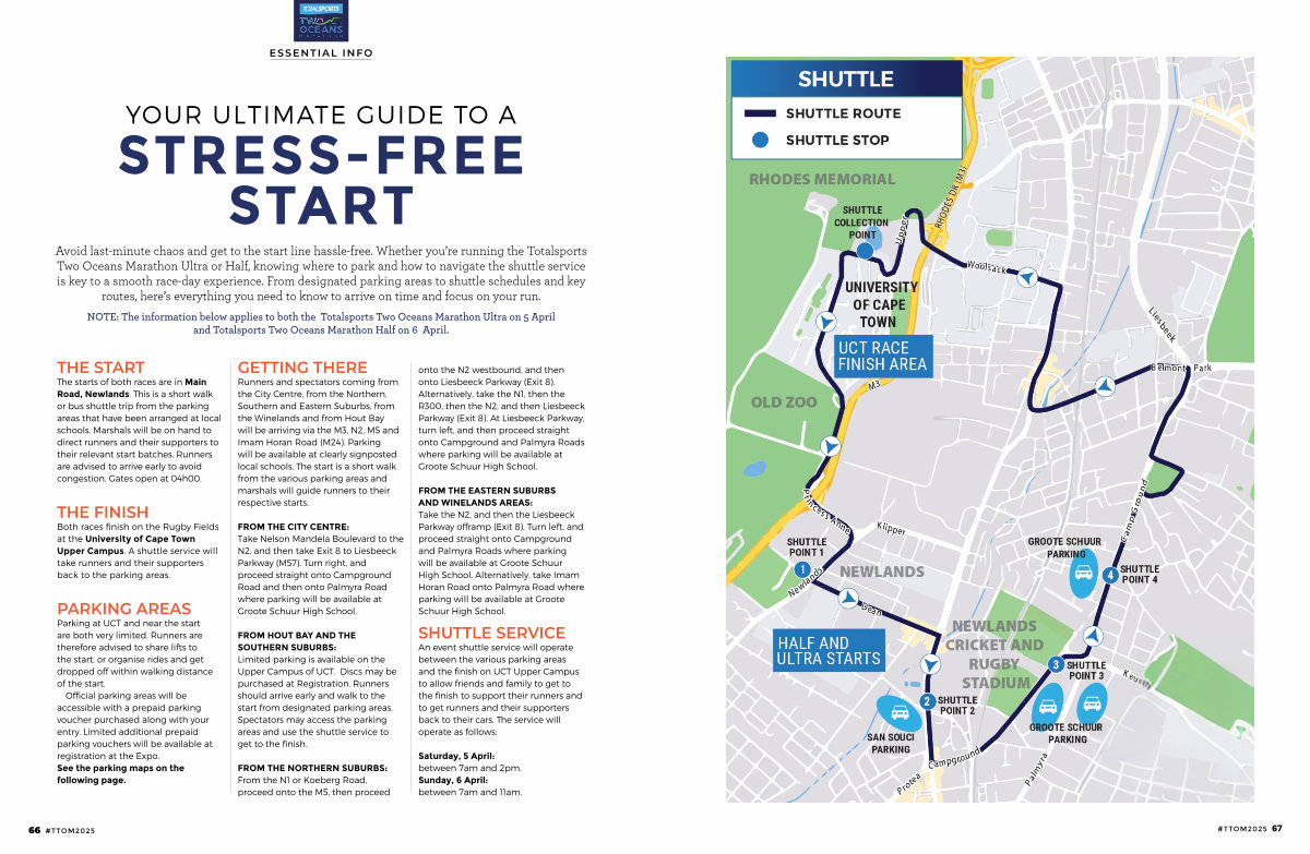 Avoid last-minute chaos and get to the start line hassle-free. Whether you’ re running the Totalsports Two Oceans Marathon Ultra or Half, knowing where to park and how to navigate the shuttle service is key to a smooth race-day experience. From designated parking areas to shuttle schedules and key routes, here’ s everything you need to know to arrive on time and focus on your run.