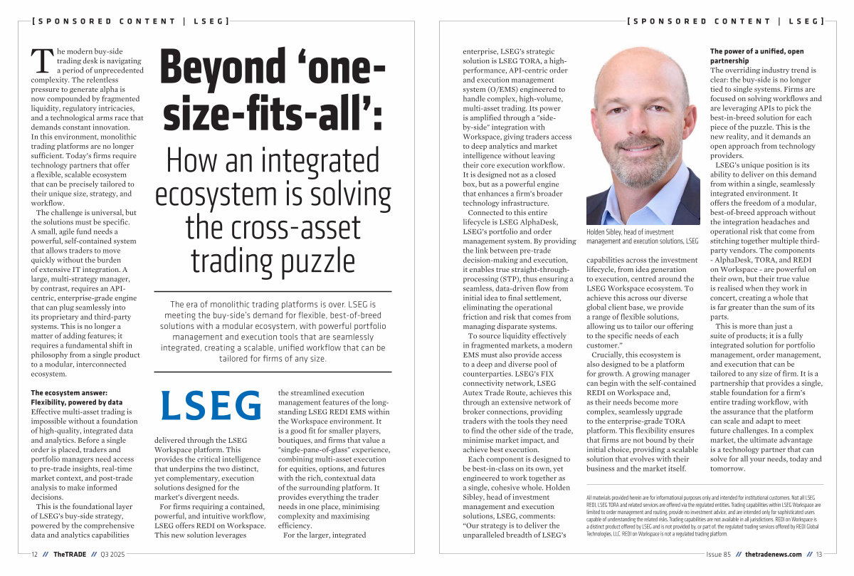 Each component is designed to be best-in-class on its own, yet engineered to work together as a single, cohesive whole. Holden Sibley, head of investment management and execution solutions, LSEG, comments:“ Our strategy is to deliver the unparalleled breadth of LSEG’ s