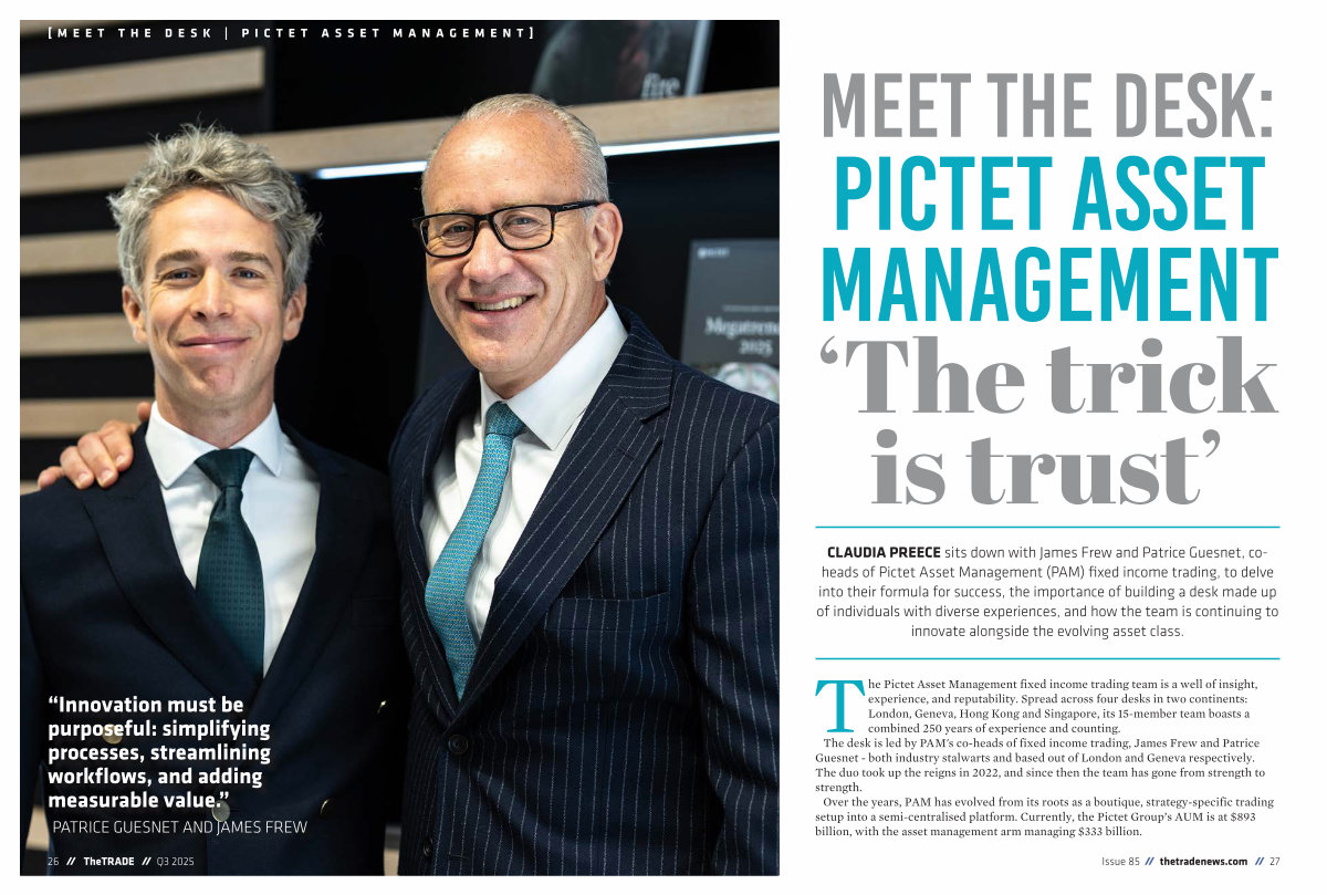 CLAUDIA PREECE sits down with James Frew and Patrice Guesnet, coheads of Pictet Asset Management( PAM) fixed income trading, to delve into their formula for success, the importance of building a desk made up of individuals with diverse experiences, and how the team is continuing to innovate alongside the evolving asset class.