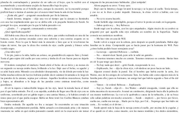 ninguna de las precauciones habituales. ¡ Qué estúpida! Ahora pagaría su error. Y muy caro. Dejó caer la linterna y luego levantó la navaja y se la puso al cuello. Tenía tiempo, y eso no se lo iban a poder impedir. Entonces, la chica volvió a hablar, con voz amable.— No se te ocurra hacerlo. Sarah farfulló algo ininteligible, porque el terror le ponía un nudo en la garganta.— Sabes quién soy … Soy Rebecca. Sarah negó con la cabeza, con los ojos empañados. Algún rincón de su cerebro se preguntó por qué aquella niña styx utilizaba un nombre de la Superficie. Nadie conocía sus auténticos nombres.— Me has visto en casa de Will. Sarah volvió a negar con la cabeza, pero después se quedó paralizada. Había algo familiar en la chica. Comprendió que se hacía pasar por la hermana de Will. Pero ¿ cómo había podido hacer semejante cosa?— La navaja— apremió Rebecca—, suéltala.— No— intentó decir Sarah, pero sólo le salió un gemido.— Nosotras tenemos mucho en común. Tenemos intereses en común. Harías bien en oír lo que tengo que decirte.— No hay nada que decir— gritó Sarah, recuperando la voz.— Explícaselo, Joe— dijo la chica styx, volviéndose un poco hacia un lado. Alguien avanzó desde la pared. Era el hombre que había escrito la carta, Joe Waites, uno de los amigos de su hermano Tam. Joe había sido como alguien más de la familia para ella y para su hermano, un amigo leal que habría seguido a Tam al fin del mundo.— Vamos— le ordenó Rebecca—. Explícaselo.— Soy yo, Sarah— dijo él—. Joe Waites— añadió enseguida, viendo que ella no daba muestras de reconocerlo. Avanzó un centímetro, dirigiendo hacia ella la palma de sus manos temblorosas. La voz se le quebraba a causa de la turbación, y de su boca sólo salían palabras sin mucho concierto—. Sarah— imploró—, por favor, por favor, suelta eso, suelta esa navaja … Hazlo por tu hijo, por Cal … Supongo que has leído mi carta … Es verdad, es el divino …
