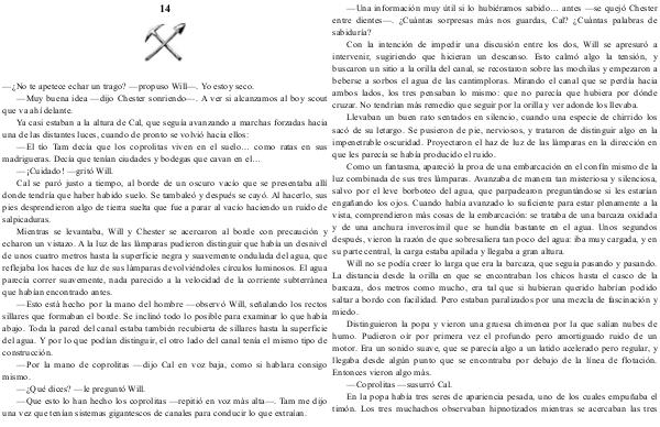 Con la intención de impedir una discusión entre los dos, Will se apresuró a intervenir, sugiriendo que hicieran un descanso. Esto calmó algo la tensión, y buscaron un sitio a la orilla del canal, se recostaron sobre las mochilas y empezaron a beberse a sorbos el agua de las cantimploras. Mirando el canal que se perdía hacia ambos lados, los tres pensaban lo mismo: que no parecía que hubiera por dónde cruzar. No tendrían más remedio que seguir por la orilla y ver adonde los llevaba.