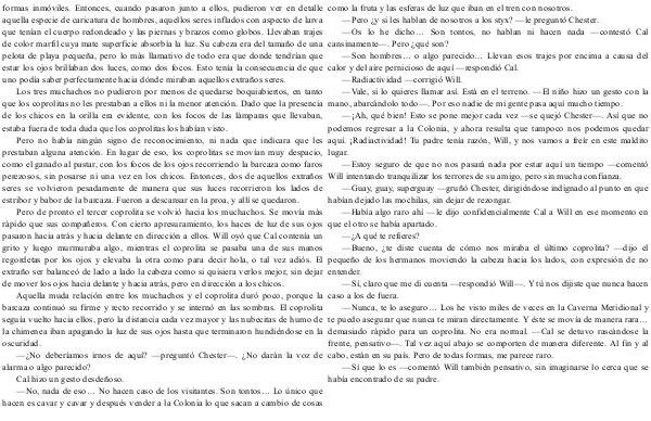 —¡ Ah, qué bien! Esto se pone mejor cada vez— se quejó Chester—. Así que no podemos regresar a la Colonia, y ahora resulta que tampoco nos podemos quedar aquí. ¡ Radiactividad! Tu padre tenía razón, Will, y nos vamos a freír en este maldito lugar.